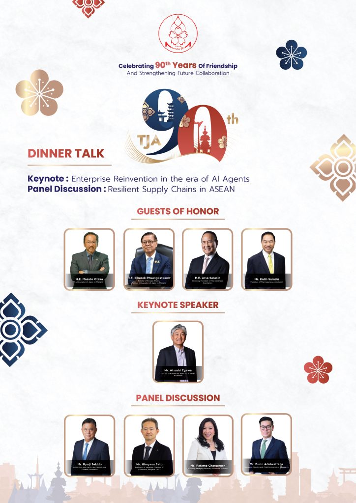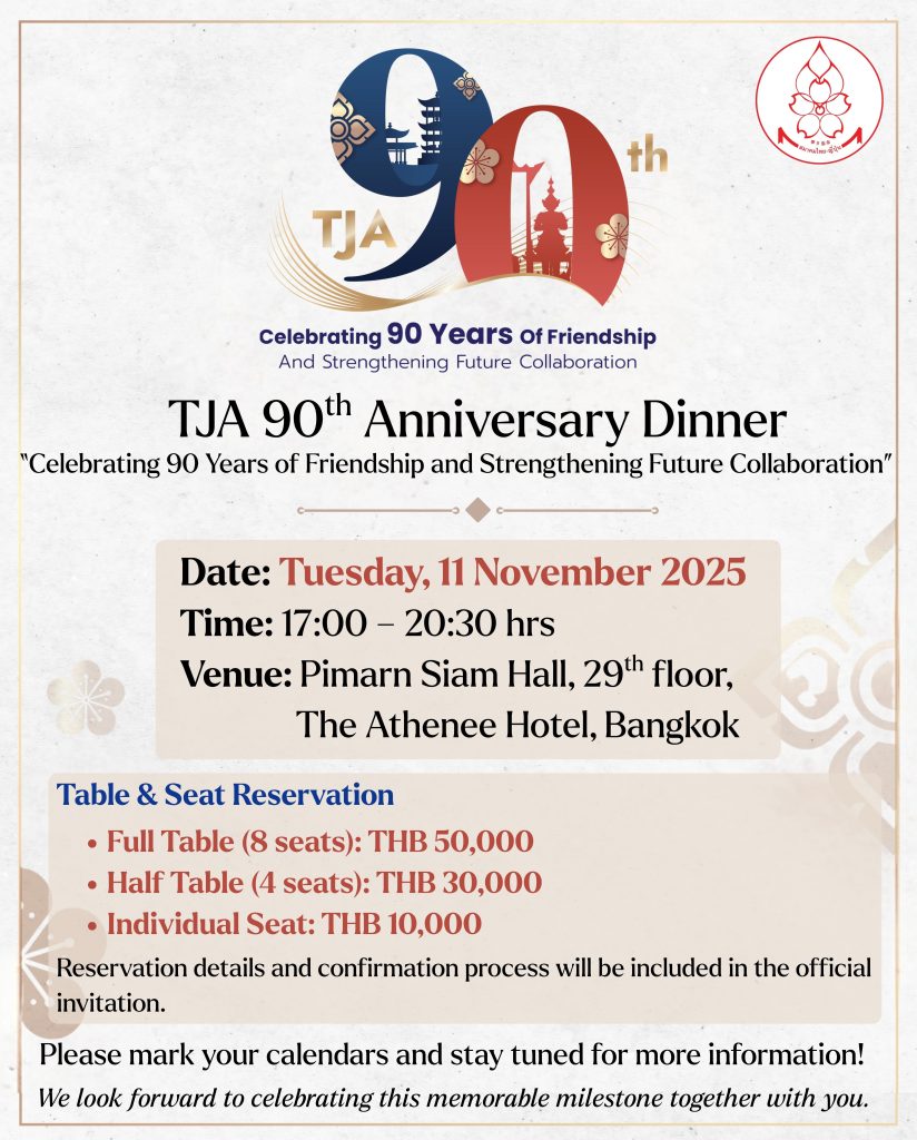 The Thai-Japanese Association is pleased to announce a special occasion to celebrate our 90th Anniversary. We warmly invite you to join us for an evening of inspiration, networking, and friendship at our TJA 90th Anniversary Dinner under the theme: “Celebrating 90 Years of Friendship and Strengthen Future Collaboration”