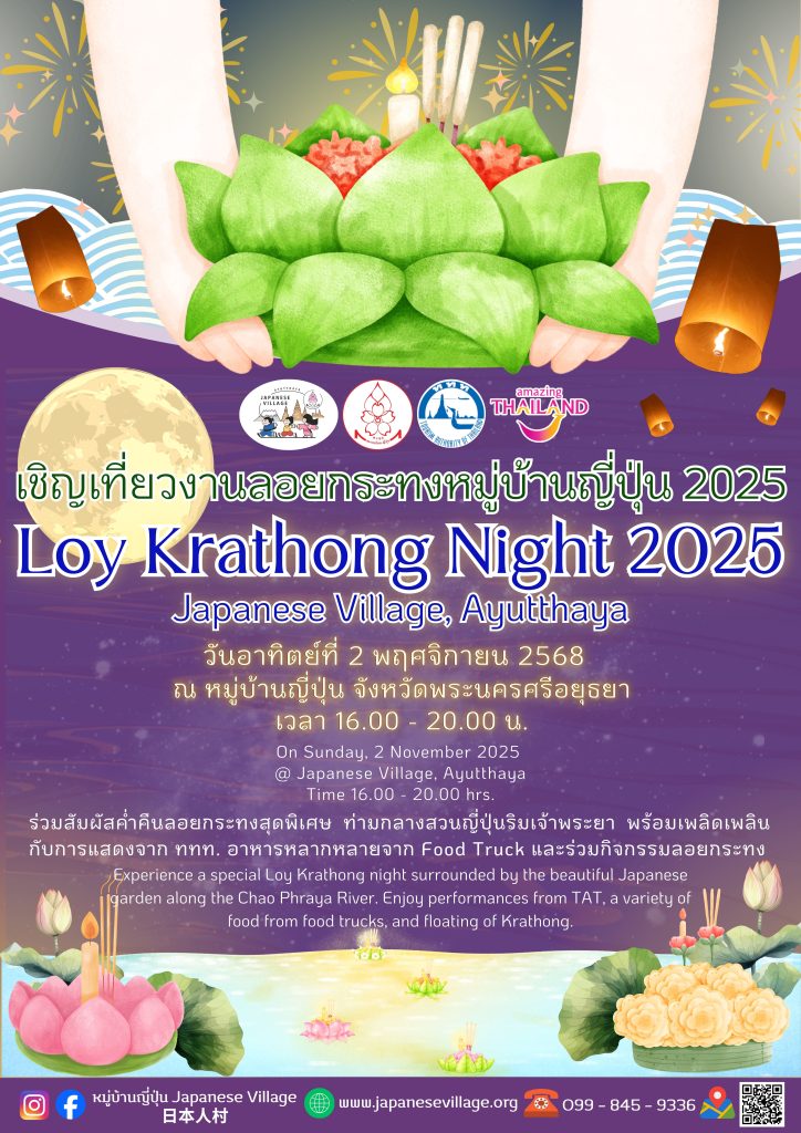 “Loy Krathong Night 2025” will be held at Japanese Village, Ayutthaya on Sunday, November 2, 2025 from 16:00 to 20:00 hrs. (Admission is free after 17:00 hrs.).