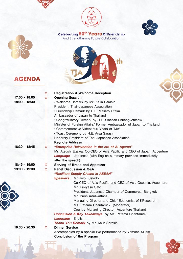 The Thai-Japanese Association is pleased to announce a special occasion to celebrate our 90th Anniversary. We warmly invite you to join us for an evening of inspiration, networking, and friendship at our TJA 90th Anniversary Dinner under the theme: “Celebrating 90 Years of Friendship and Strengthen Future Collaboration”